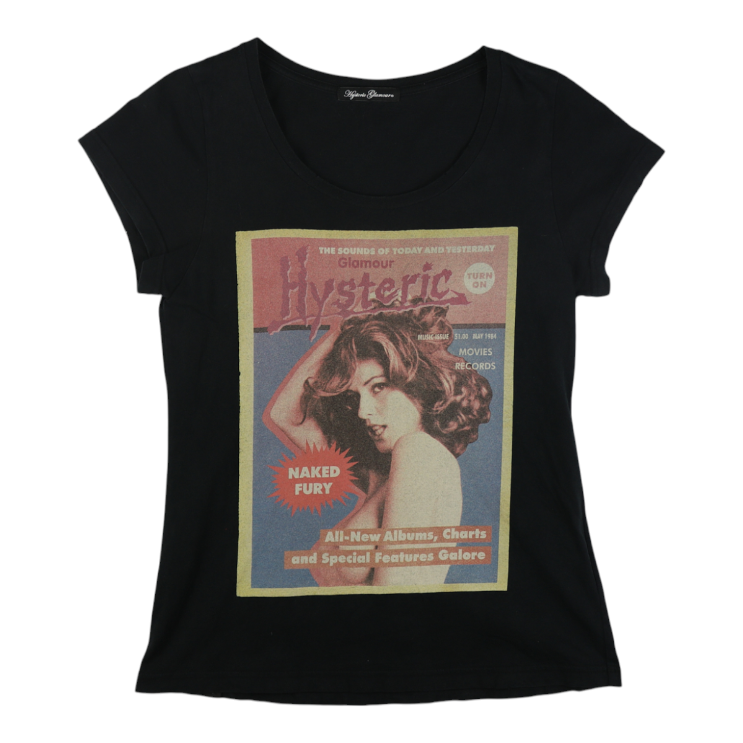 Black Hysteric Glamour T-shirt featuring a large front graphic designed like a vintage magazine cover, with bold text elements such as “Hysteric”, “Naked Fury”, and retro-style cover lines. Classic crewneck with a fitted women’s cut.