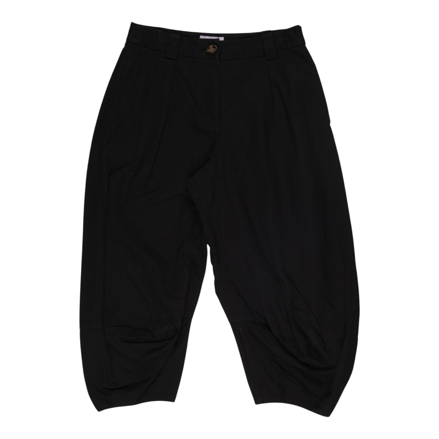 A bold silhouette from Vivienne Westwood’s Red Label line, these black wide capri pants feature a structured, cropped fit with voluminous draping through the leg. Finished with pleated details and the iconic orb button at the waist, they’re a distinctive piece that channels Westwood’s signature tailoring with an avant-garde edge.