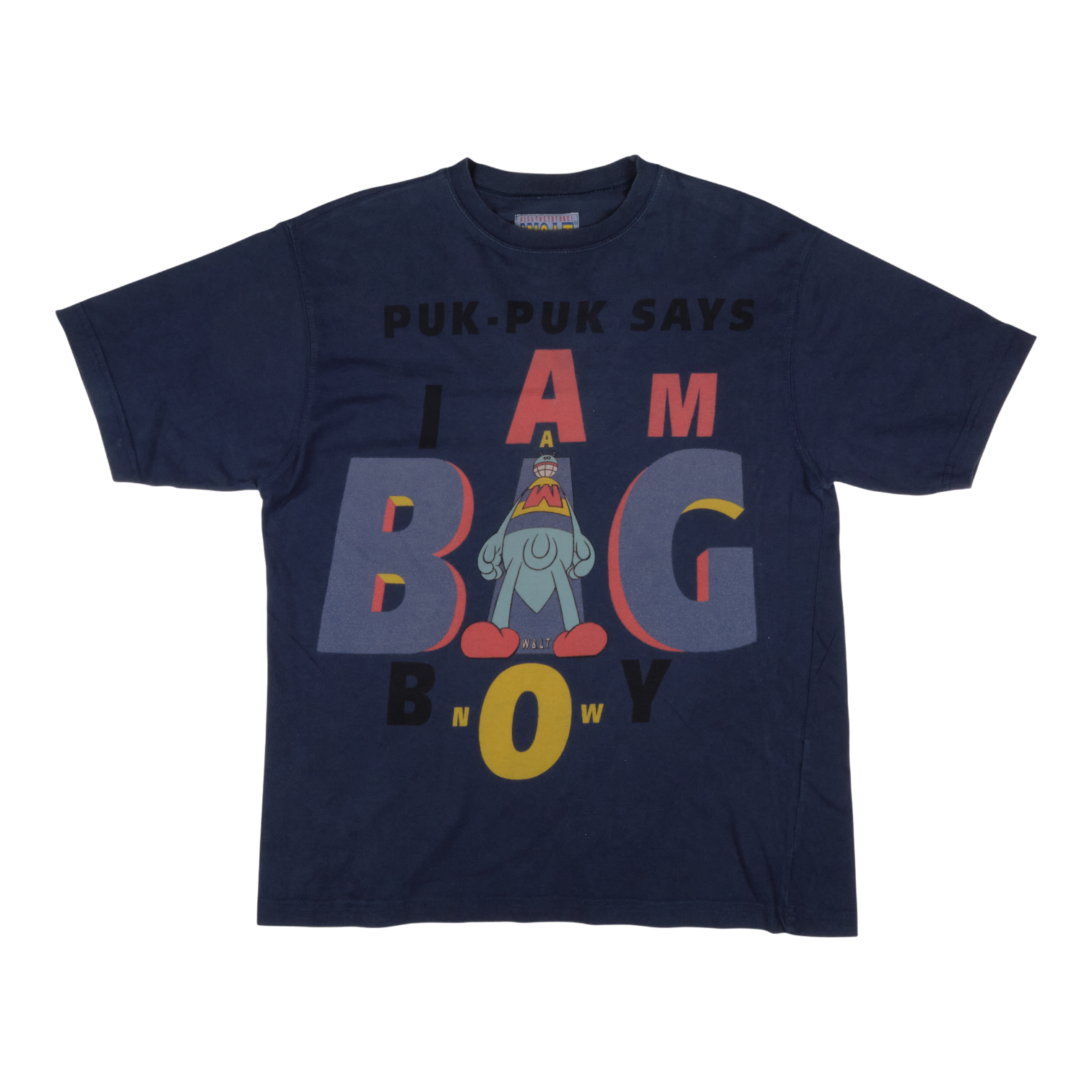 W< navy tee with a multicolour 'PUK-PUK SAYS I AM BIG BOY NOW' graphic featuring the Puk-Puk mascot.